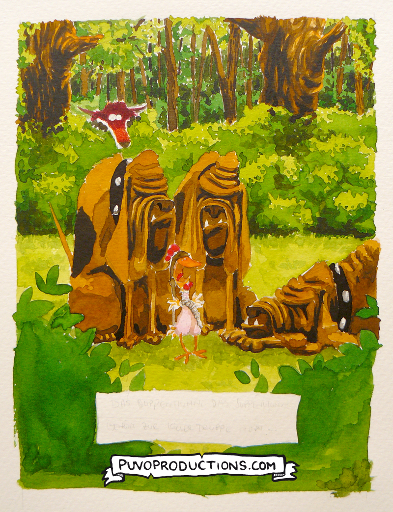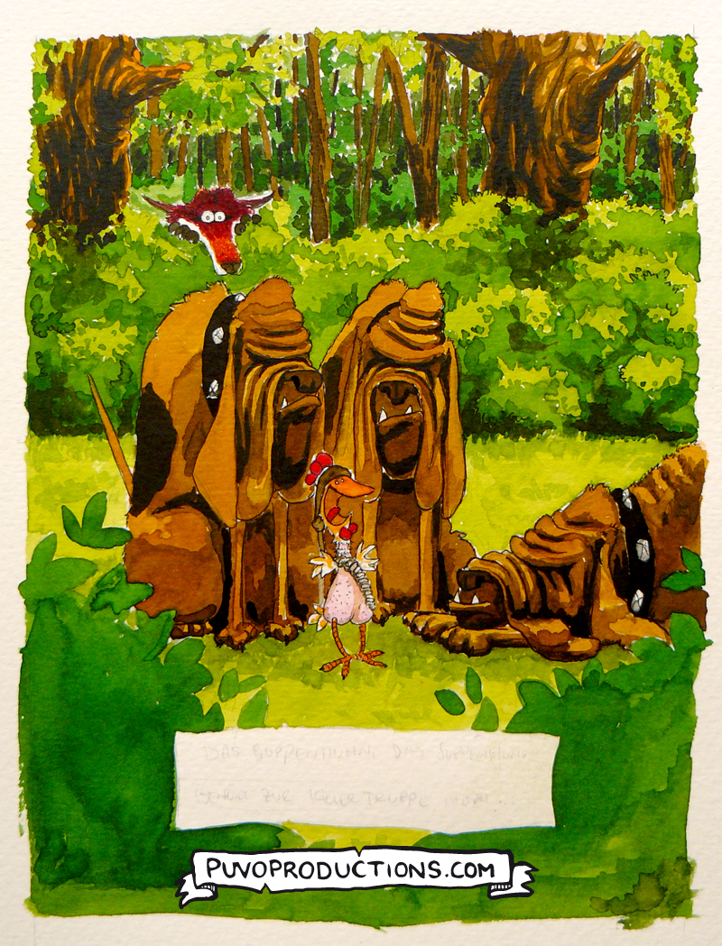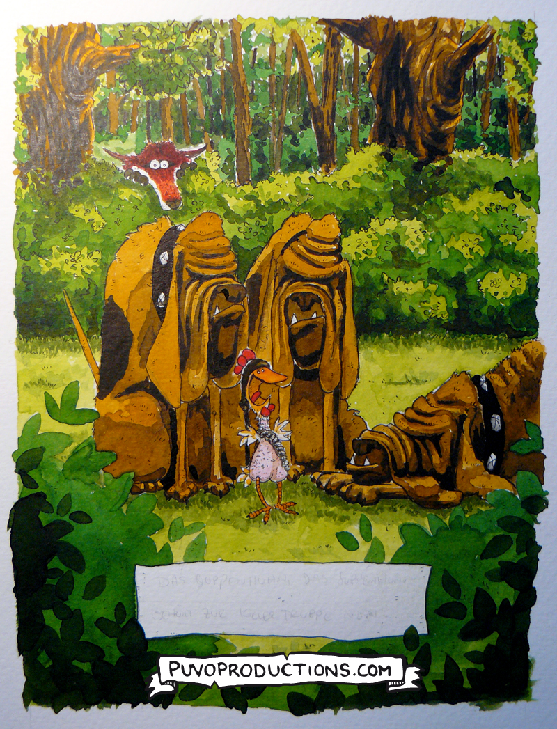 Schritt 7: Hintergrund, Fuchs, Huhn und die ersten schwarzen Details bei der Meute