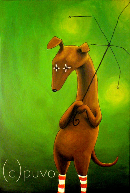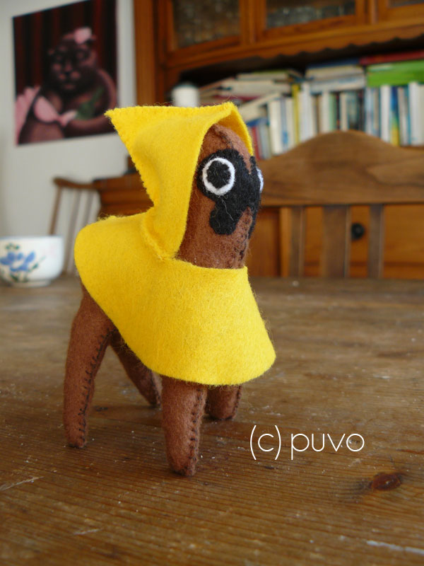 Inspiriert von diesem unglaublichen Foto und als Vorbereitung auf die hoffentlich bald mal einsetzende Herbstwetterzeit gibt´s heute mal wieder ein Filz-Viech: Boxer im Regencape! Der aufmerksame Blogleser hat natürlich auch den buckligen Prototypen noch in lebhafter Erinnerung…